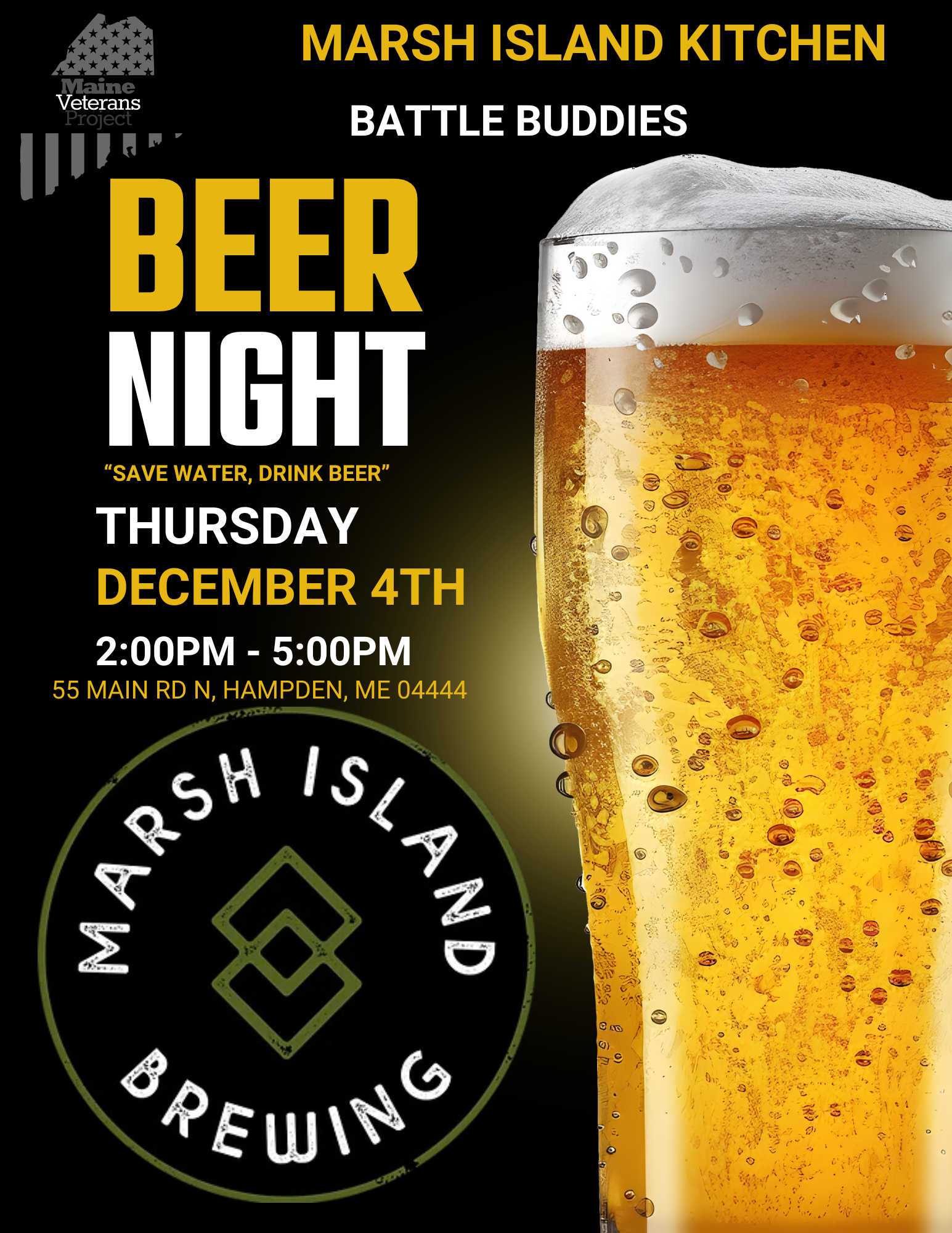 « All Events This event has passed. Beer Night December 4, 2025 @ 2:00 pm - 5:00 pm « Thanksgiving Distribution Event Army / Navy Football » Add to calendar Google Calendar iCalendar Outlook 365 Outlook Live Details Date: December 4, 2025 Time: 2:00 pm - 5:00 pm Event Category: Event Venue Marsh Island Kitchen 55 Hampden Rd Hampden, ME 04444 United States + Google Map Related Events Food Drive April 17 @ 2:00 pm - 6:00 pm Sweat for the Vets – Field Day Fundraiser August 15 @ 9:00 am - 1:00 pm