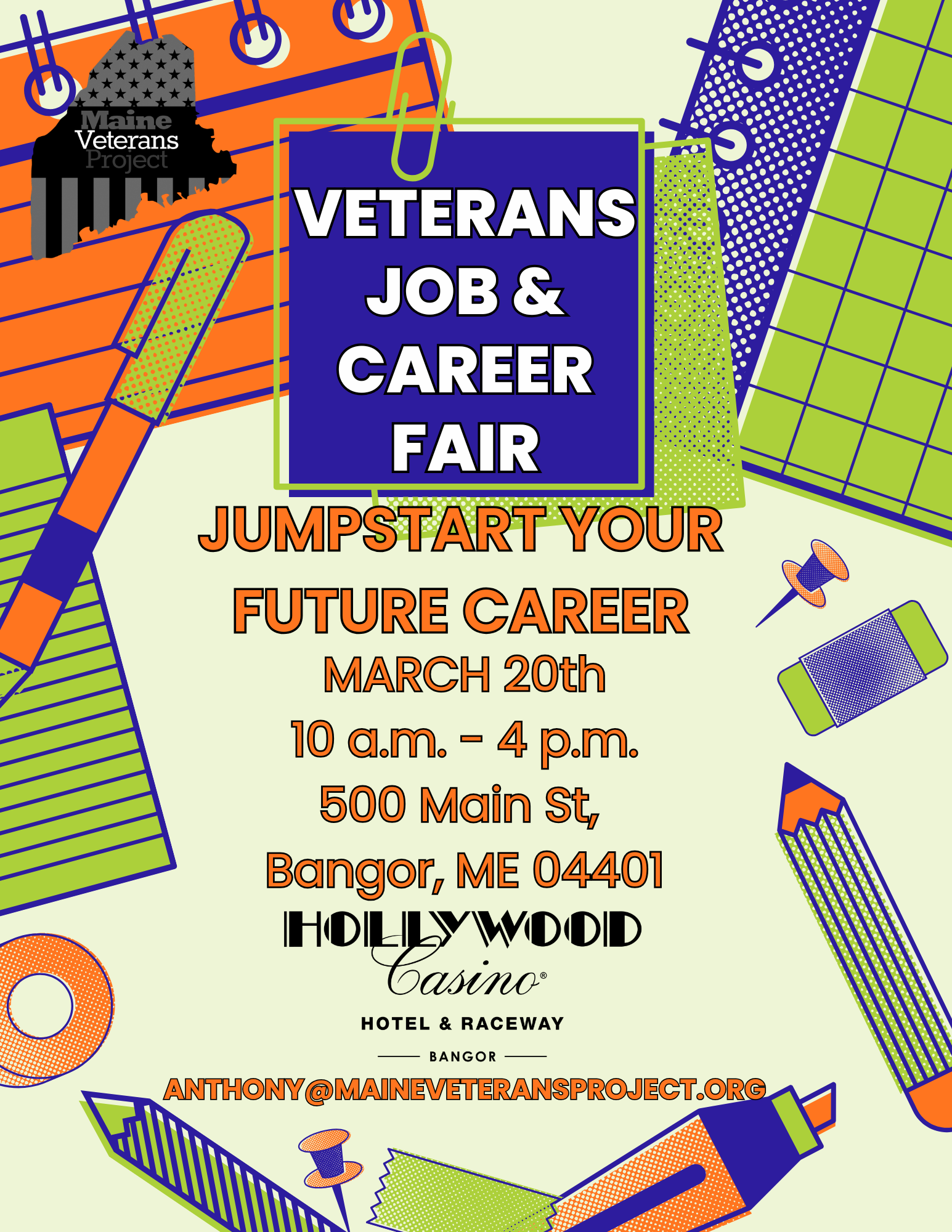 Hollywood Casino 50 Main St, Bangor, ME, United StatesVeterans Jobs and Career Fair March 20th 10am - 4 pm 500 Main St Bangor Maine 04401